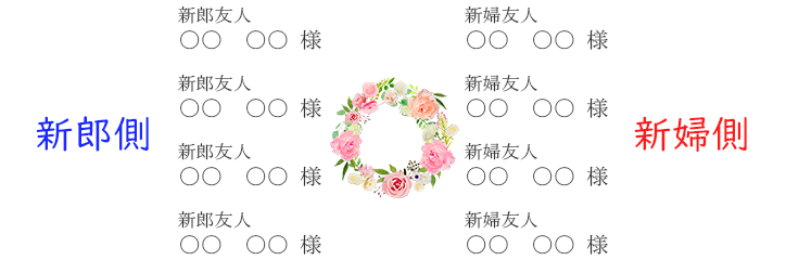 通常は、高砂に向かって左側に新郎側、右側に新婦側ですが、この場合は無理に左右に分ける必要はありません。